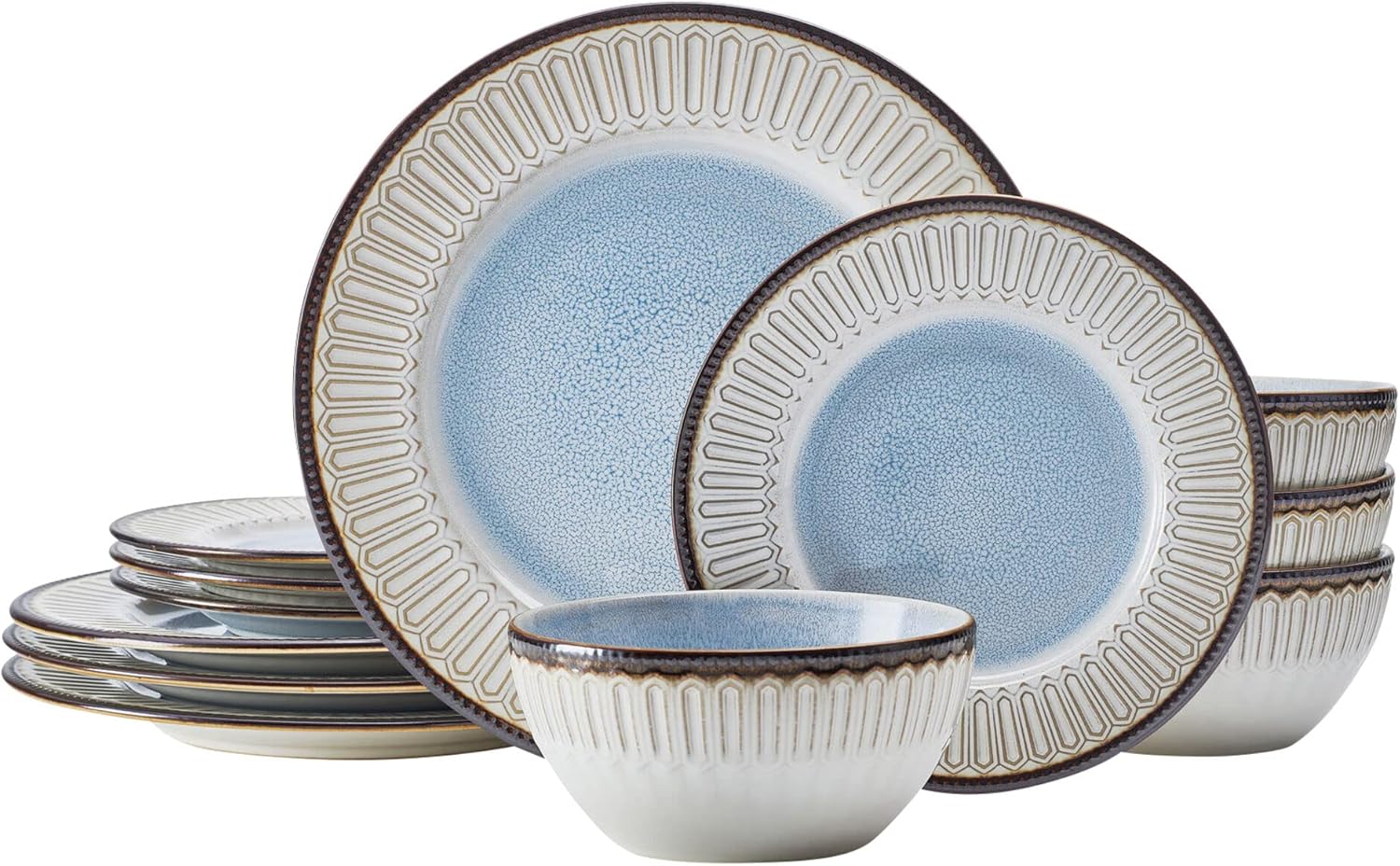 Each piece has an embossed rim with a reactive glaze center detail with shades of tan and blue. The bright color palette pops on any dining table, and the contrasting patterns on the rims and centers add a touch of modern allure. Strong and durable, this set is made from high-quality stoneware for long-lasting beauty. 12-piece set, service for 4, includes 4 each of: 11-inch dinner plate, 8-1/2 inch salad plate, and 6-1/4 inch all-purpose bowl with a 27-fluid ounce capacity. Microwave and dishwasher safe.