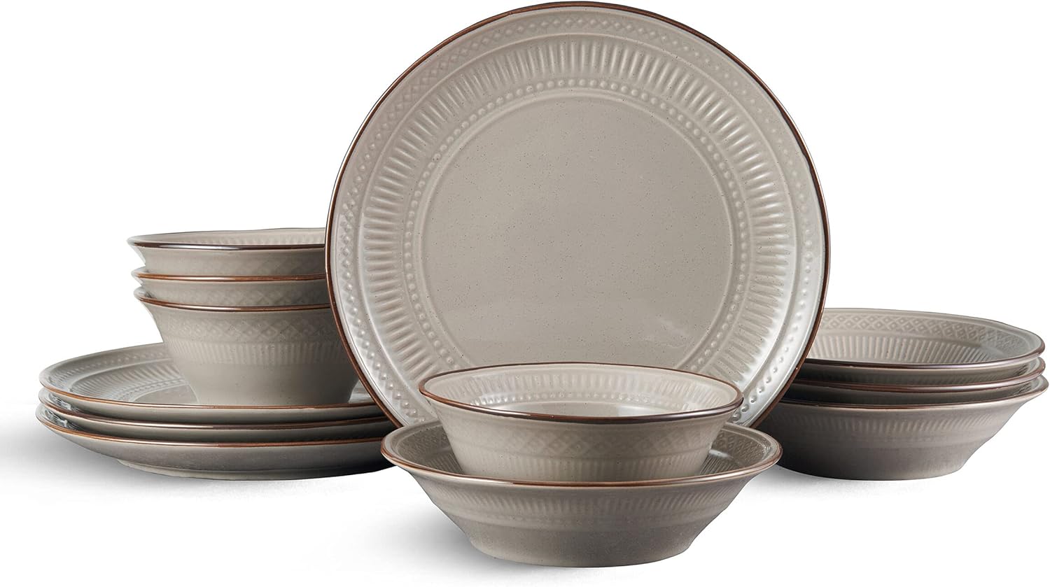 Each piece has a rustic, handcrafted look with bands of varying line designs around the rims. The taupe color is highlighted by dark edge accents and a distinct speckled effect with a reactive glaze finish. Made from high-quality stoneware for long-lasting beauty and durability. Note that due to the nature of reactive glaze, no two pieces are exactly alike and will exhibit unique variations in color and pattern. 12-piece set, service for 4, includes 4 each of: 10-3/4 inch dinner plate, 8-inch pasta bowl with a 23.5-fluid ounce capacity, and 6-1/4 inch appetizer bowl with a 21.50-fluid ounce capacity. Dishwasher and microwave safe.