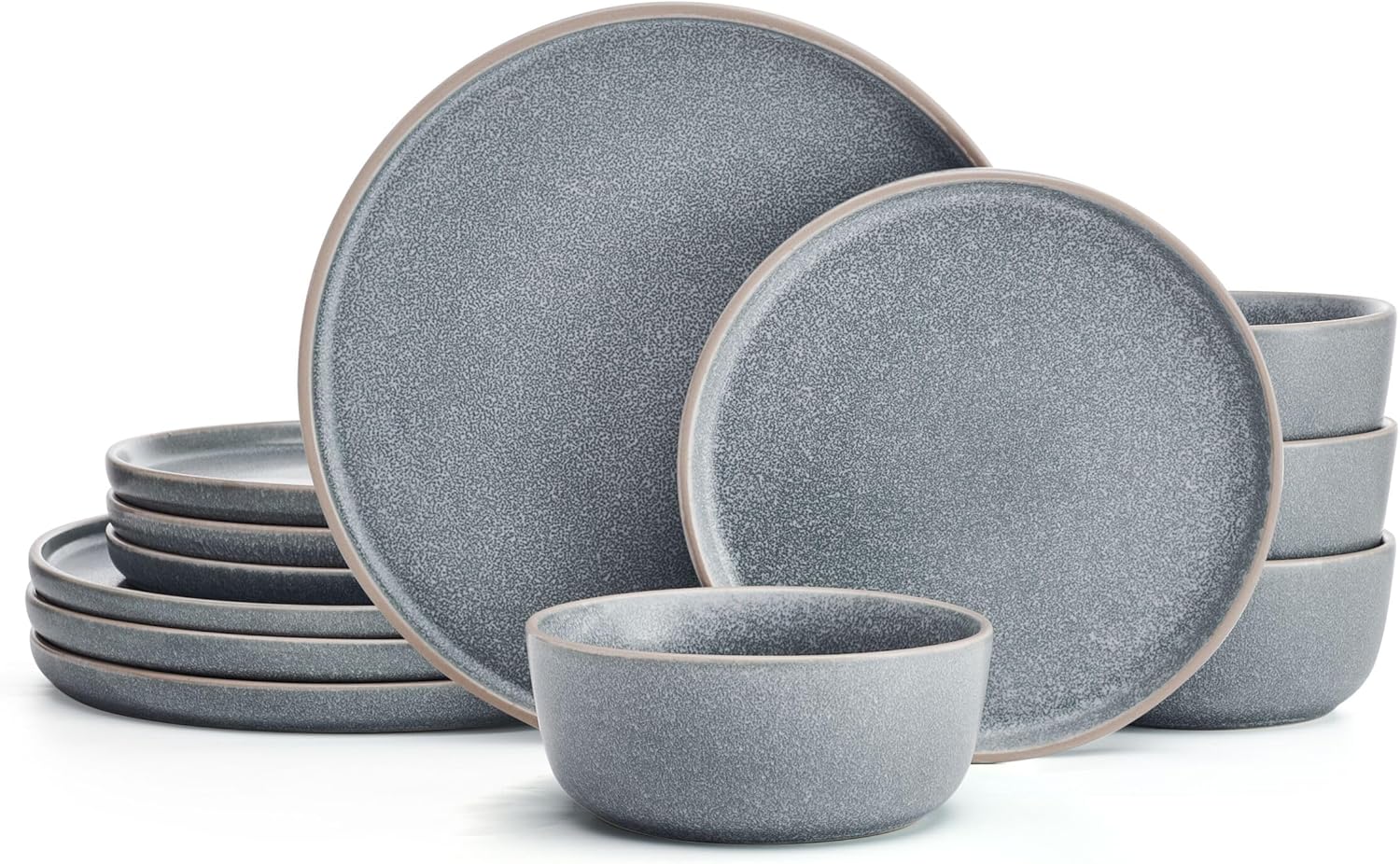 Made of strong and durable high-quality stoneware for long-lasting beauty, this contemporary collection features coupe-shaped pieces with a blue, semi-matte reactive finish and bisque accent around the rims. A striking addition to your dining table, this sophisticated yet casual dinnerware is perfect for everyday dining or light entertaining. 12-piece set, service for 4, includes 4 each of: 10-1/2 inch dinner plate, 8-inch salad plate, and all-purpose bowl measuring 3 inches high by 6 inches in diameter with a 24.5-fluid ounce capacity. Microwave and dishwasher safe.